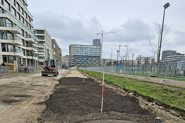 Beluchtingssysteem aanleggen en boomgranulaat onder parkeerplaatsen tbv van bomen die tussen de parkeerplaatsen worden geplant.